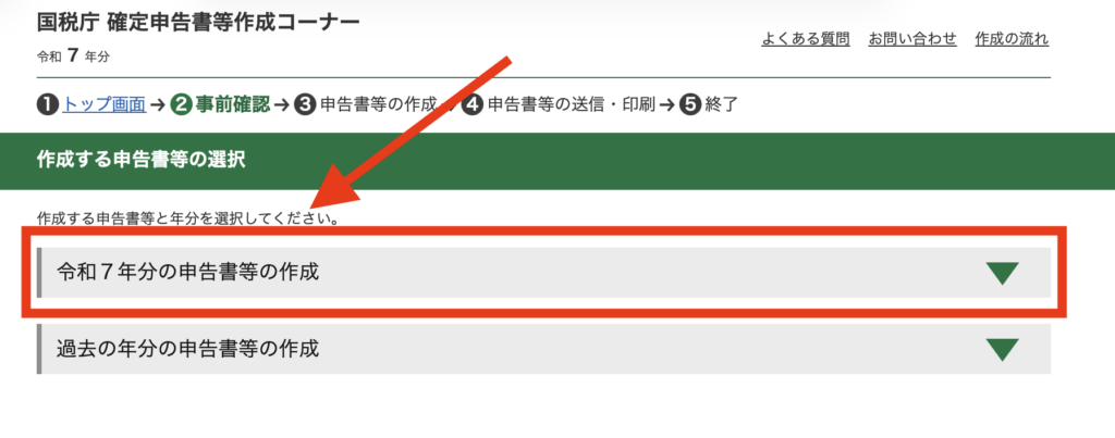 「令和7年分の申告書等の作成」を選択し