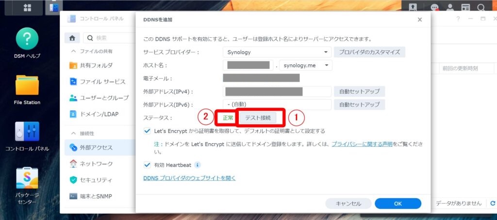 サービスプロバイダーで”Synology”を選択するとNASを設定した時に登録している電子メールが自動的に入力され、また、外部アドレスも自動的に入力されます。