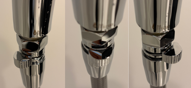 操作しづらい理由は、レバーの取り付け位置。シャワーヘッドとホースの間にあるので、シャワーヘッドを持っているときは指が届きにくいのです。