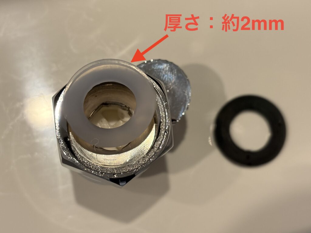 バルブに取り付けられている半透明のパッキンの厚みは約2mm。