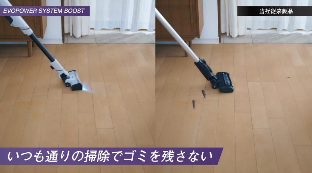 - 引いても吸う(アクティブフラップ): 通常の掃除機は後ろに引く時にゴミを押し出しがちですが、フラップが可動して後方のゴミも強力にキャッチします。