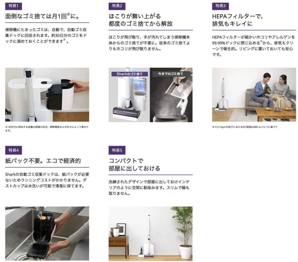 シャークの掃除機の『自動ゴミ収集ドック』は、掃除機本体をドックに戻すだけで、充電しながら本体のゴミを自動的に収集してくれる便利な機能です。